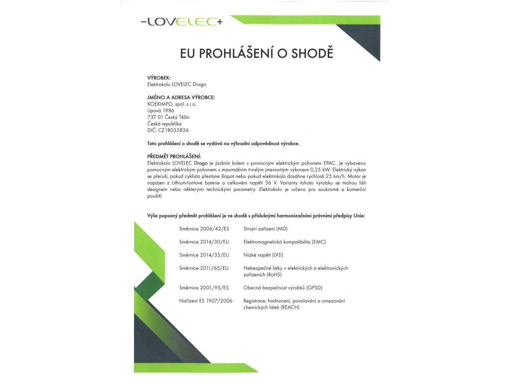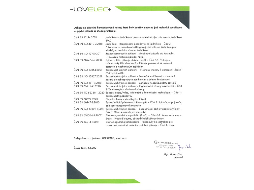 | nabíječka | EN, CE, 36 V, 2 A, doba nabíjení 4–6 hodin |