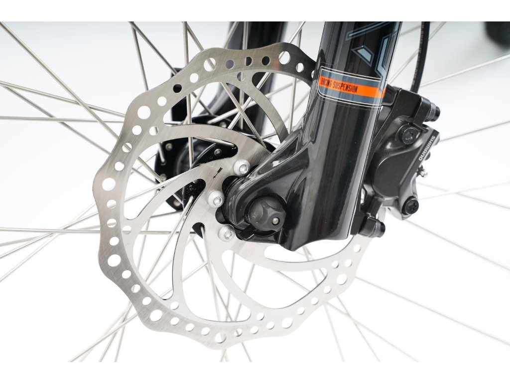Důležitou součástí elektrokola jsou hydraulické kotoučové brzdy Shimano MT501 s technologií SERVO Wave. Jedná se o systém, který umožňuje malým pohybem páčky přivést brzdové destičky a kotouč do kontaktu. V praxi to znamená mnohem rychlejší odezvu brzd, větší brzdný výkon, a tím pádem mnohem lepší kontrolu nad kolem. Můžete tak bezpečně a jistě zastavit, kdykoliv to bude potřeba.
