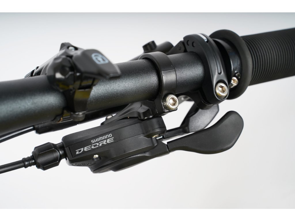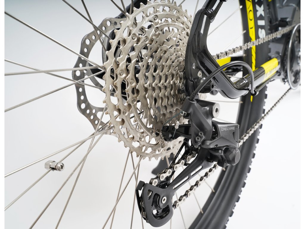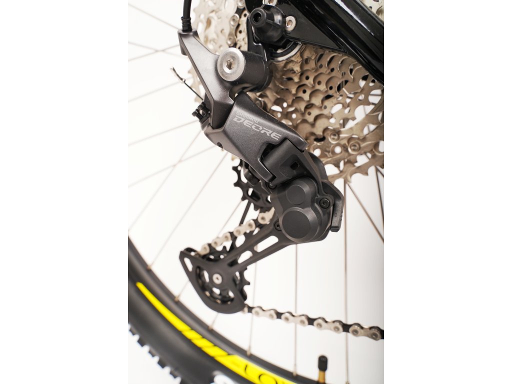 Velkou předností elektrokola je zadní přehazovačka Shimano Deore s 11 rychlostmi, která umožňuje rychlé a plynulé řazení a přizpůsobení jízdy aktuálním podmínkám na trase. Elektrokolo je navíc vybaveno vodítkem řetězu, které spolu s technologií Shadow RD+, zabraňuje padání řetězu při jízdě v náročných podmínkách.