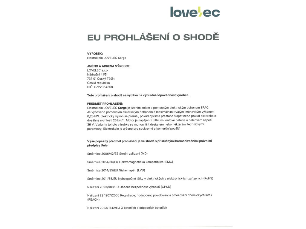 | nabíječka | EN, CE, 36 V, 2 A, doba nabíjení 4-8 hodin (závisí na kapacitě baterie a vybití) |