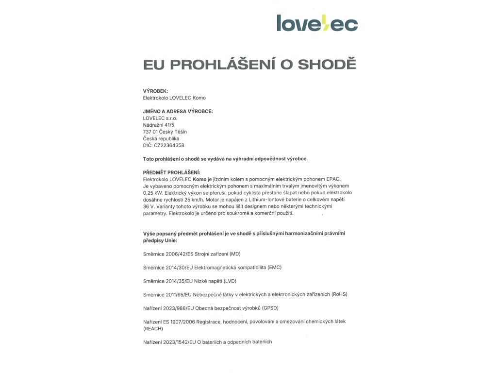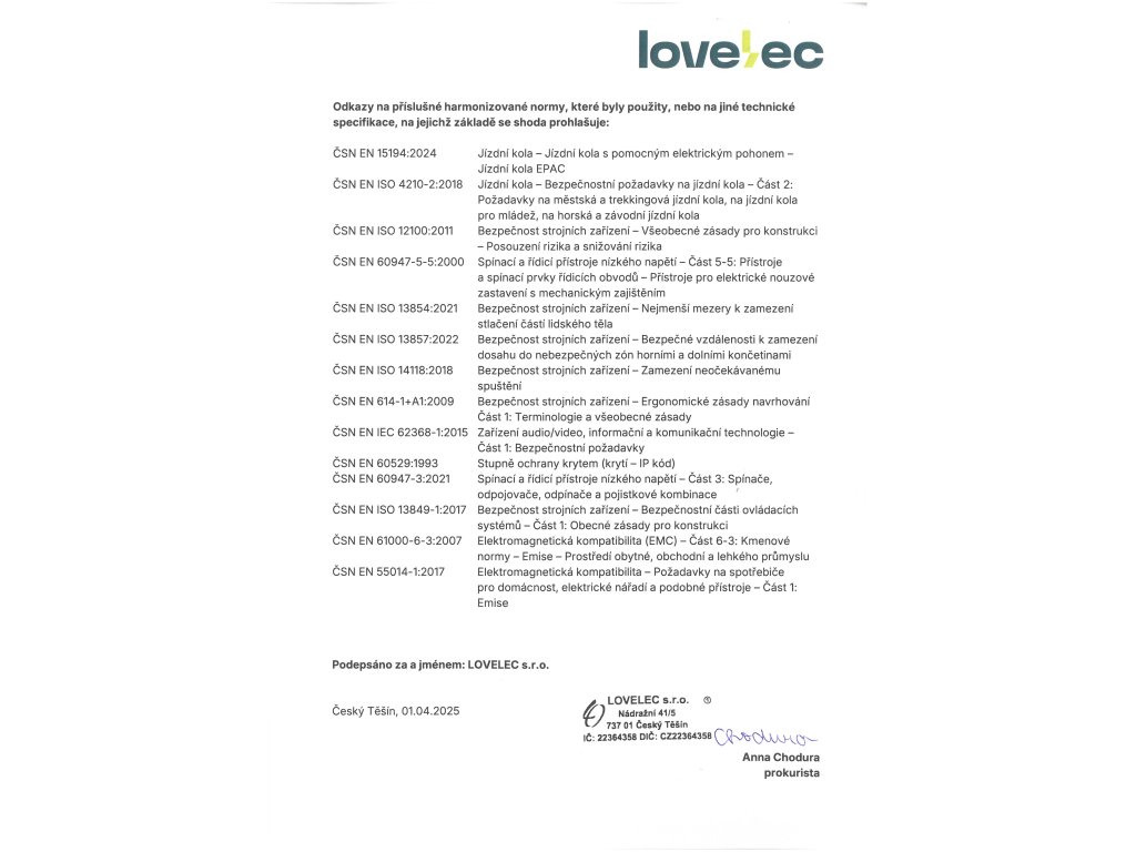 | nabíječka | EN, CE, 36 V, 2 A, doba nabíjení 4–8 hodin (závisí na kapacitě baterie a vybití) |