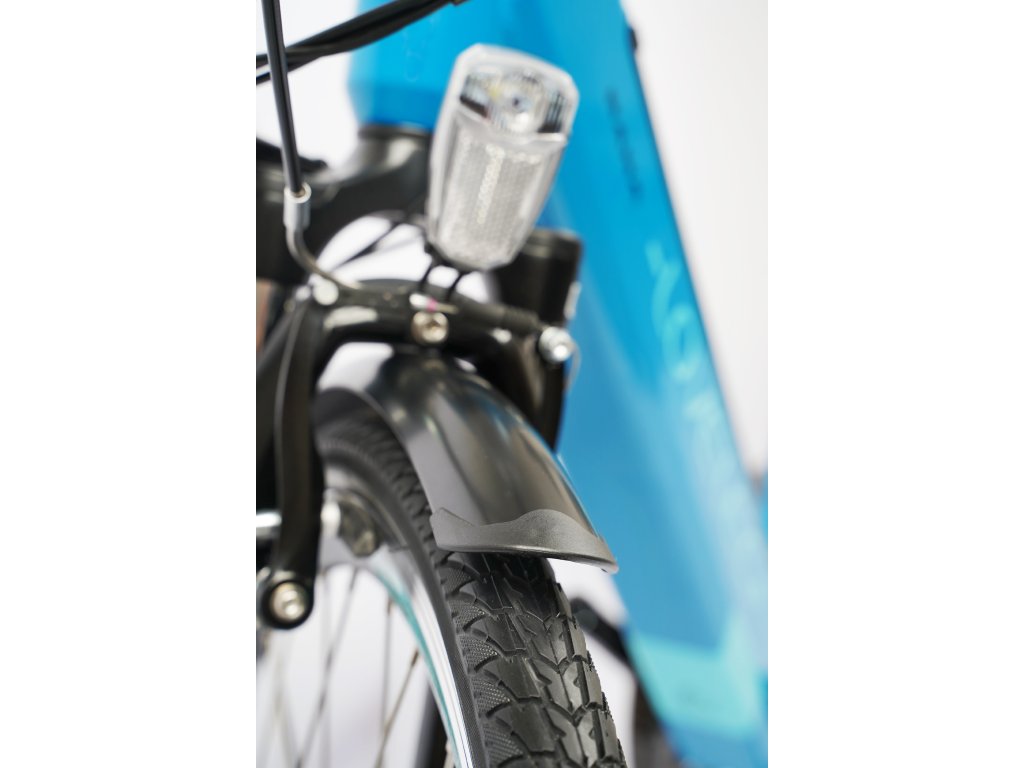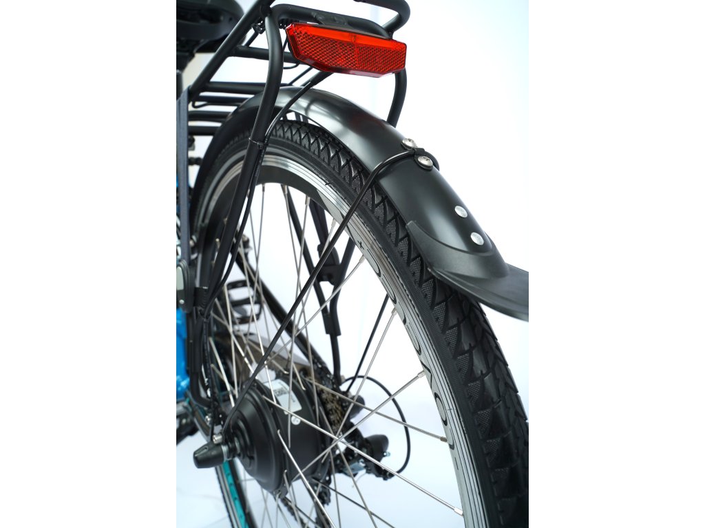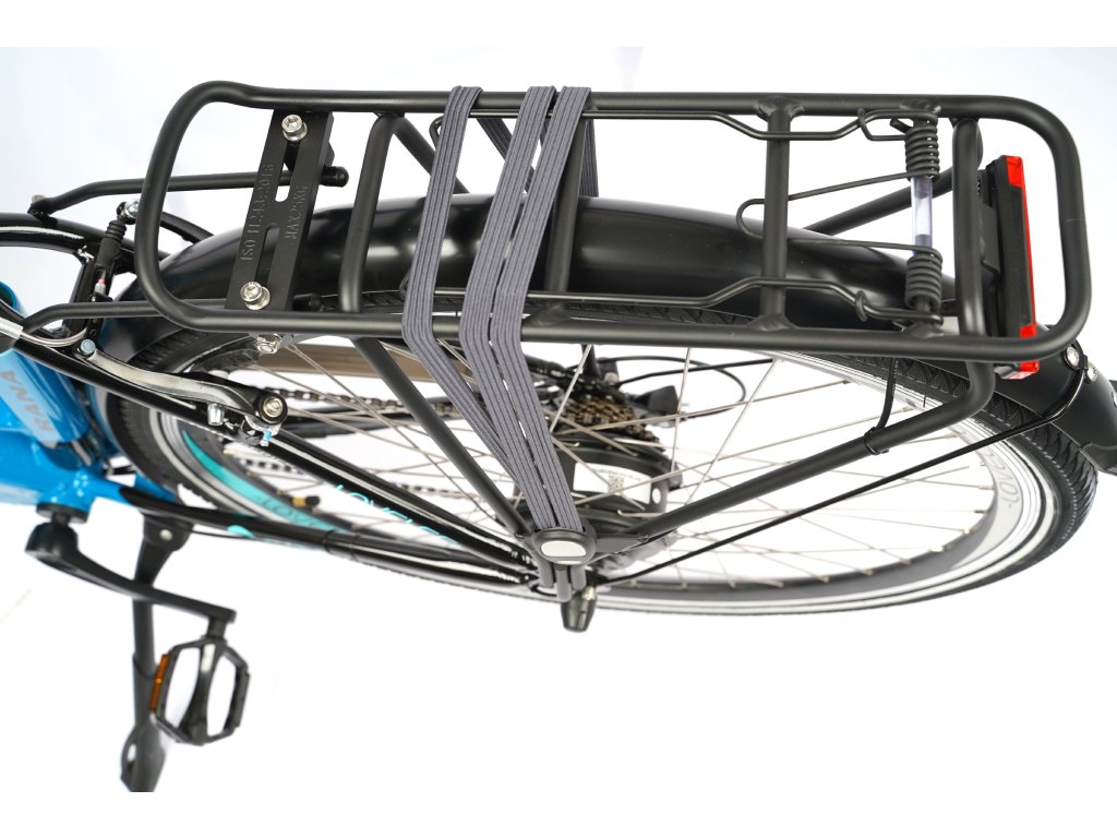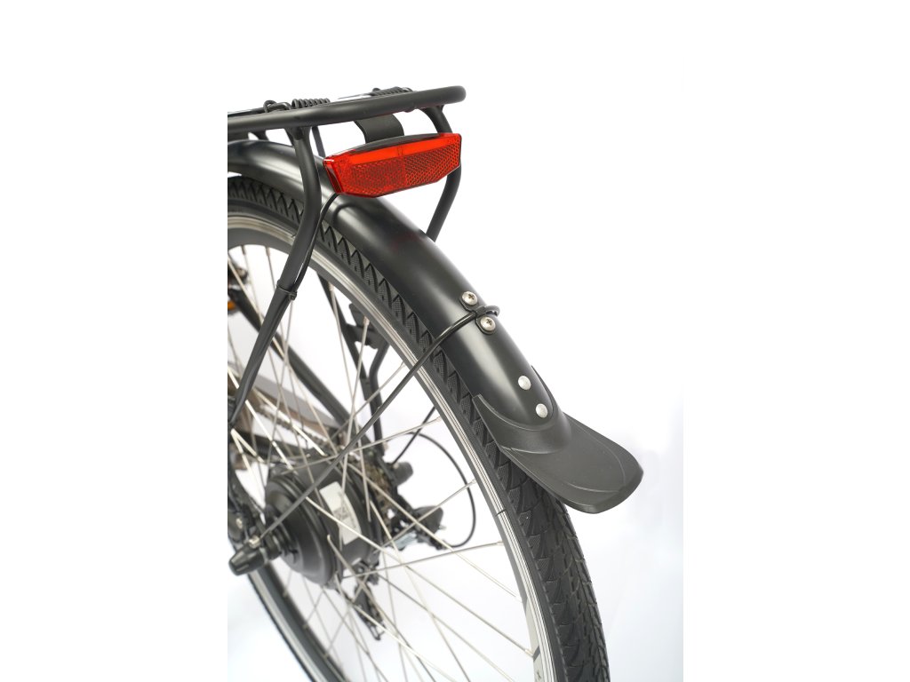 Elektrokolo je vybaveno řadou kvalitního příslušenství pro vaše maximální pohodlí během jízdy. Chodíte do práce ve formálním oblečení? Nezoufejte i v něm totiž můžete jet na našem elektrokole. Právě proto bylo vybaveno blatníky a krytem řetězu, které účinně chrání vaše oblečení před ušpiněním. Pokud potřebujete cestou domů nakoupit, žádný problém – jednoduše využijte hliníkový nosič s nosností 25 kg, kam hravě umístíte celý nákup. Až budete potřebovat věci vybalit, praktický stojan vám pomůže udržet elektrokolo ve vzpřímené poloze.
