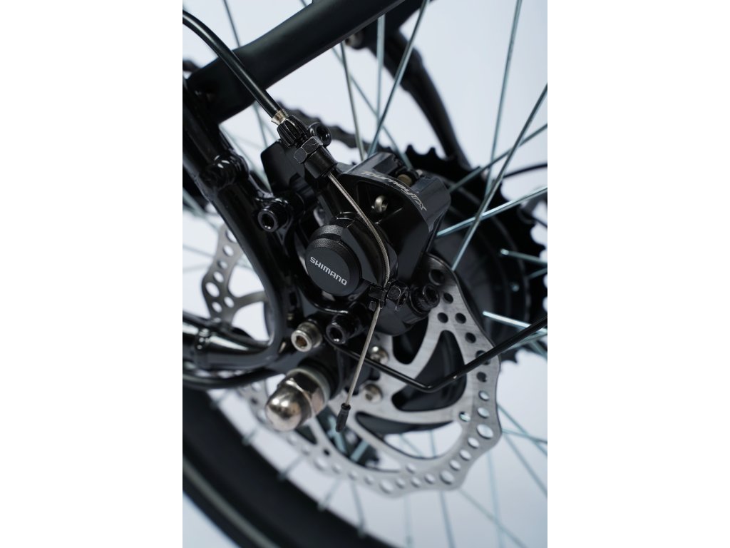Tento model využívá mechanické kotoučové brzdy Shimano Tourney, které nabízejí spolehlivý brzdný výkon a modulaci a zvyšují jistotu během jízdy v náročnějším terénu.