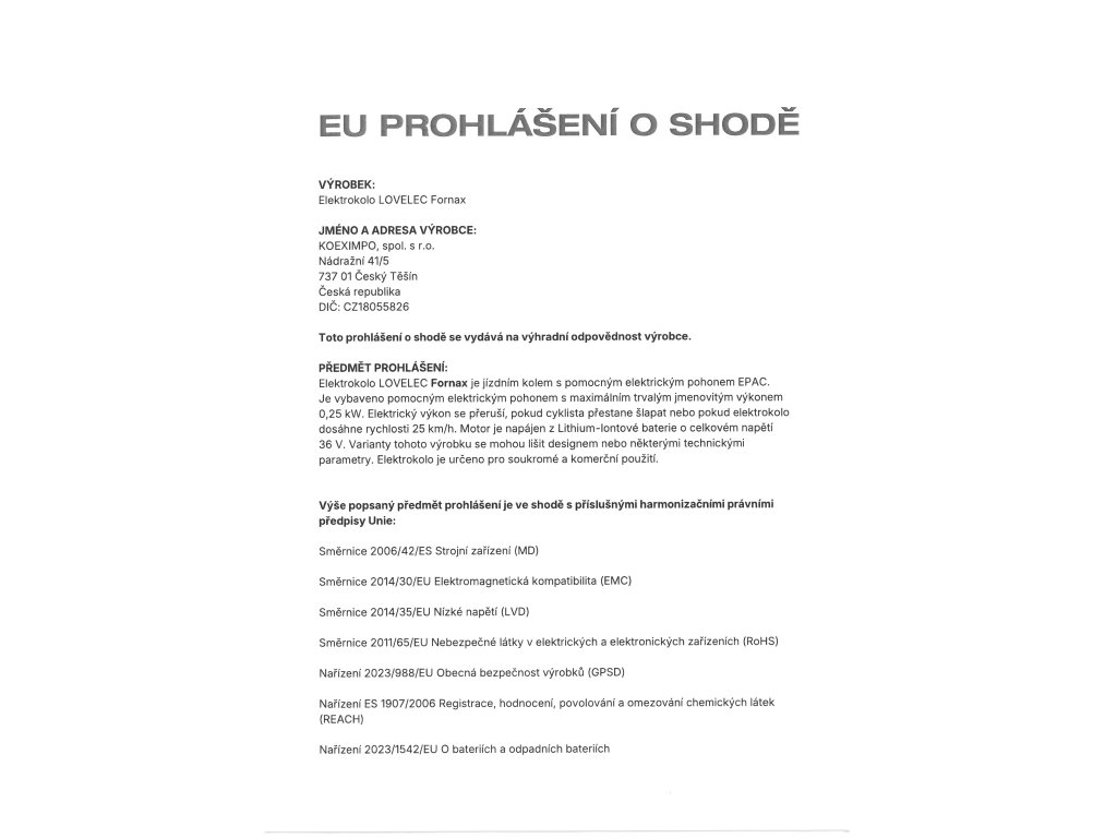 | nabíječka | EN, CE, 36 V, 2 A, doba nabíjení 4-8 hodin (závisí na kapacitě baterie a vybití) |