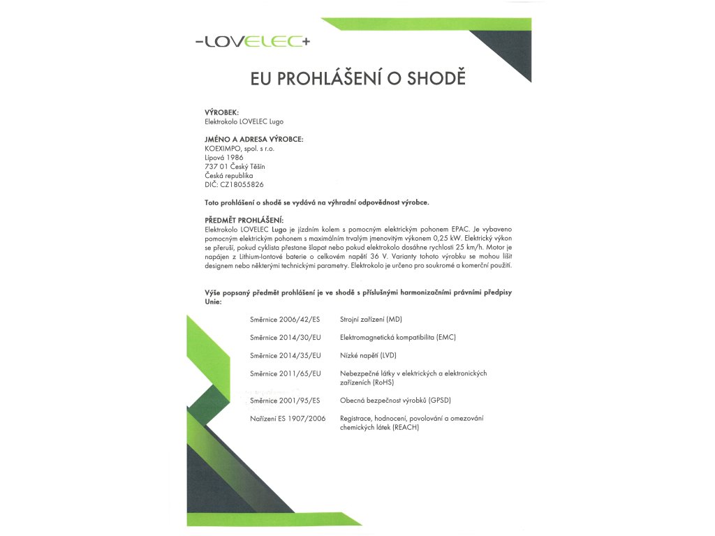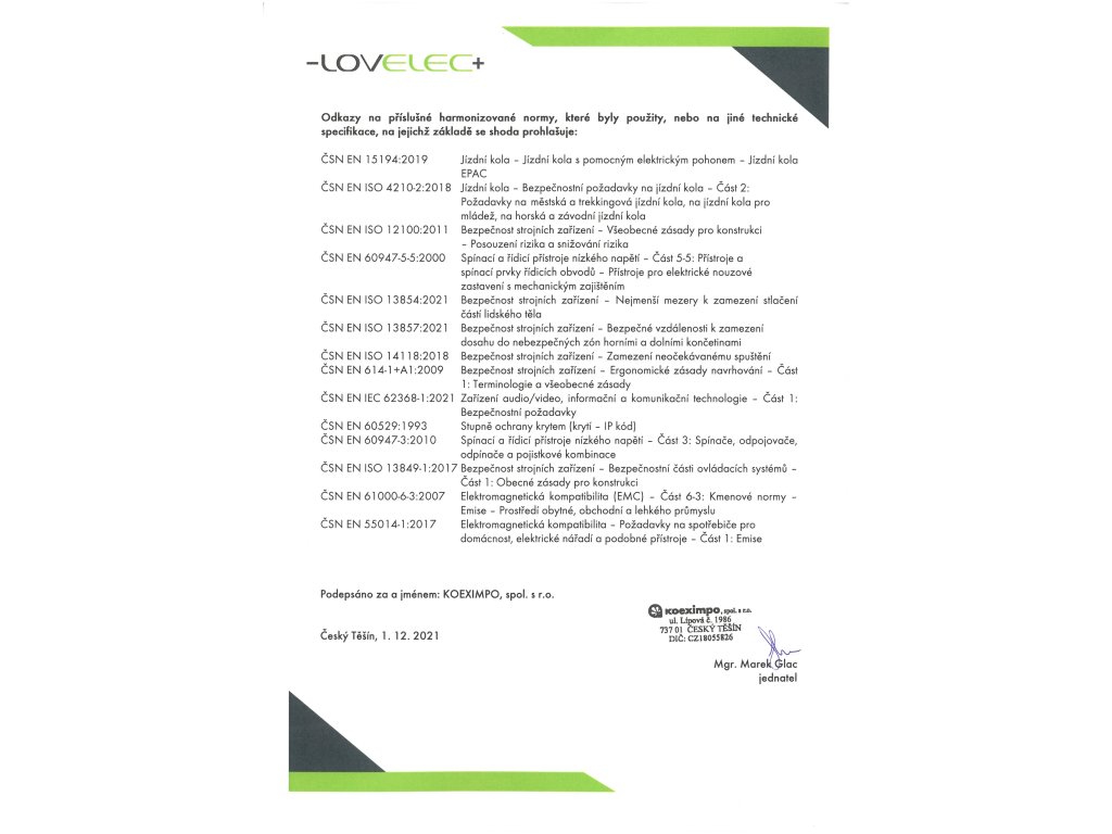 | nabíječka | EN, CE, 36 V, 2 A, doba nabíjení 4–6 hodin |
