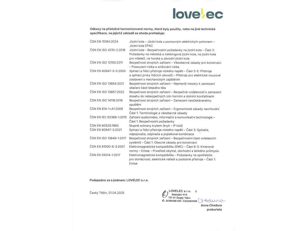 | nabíječka | EN, CE, 36 V, 2 A, doba nabíjení 4–8 hodin (závisí na kapacitě baterie a vybití) |
